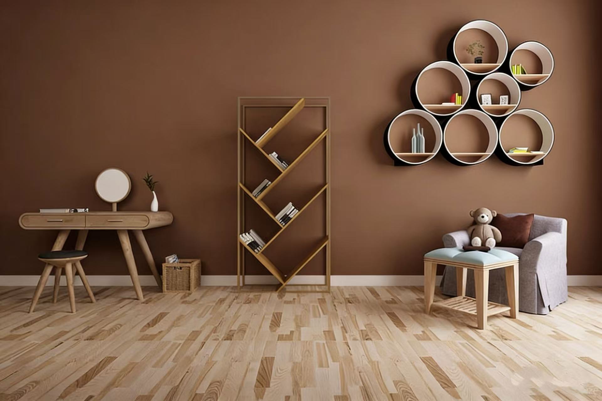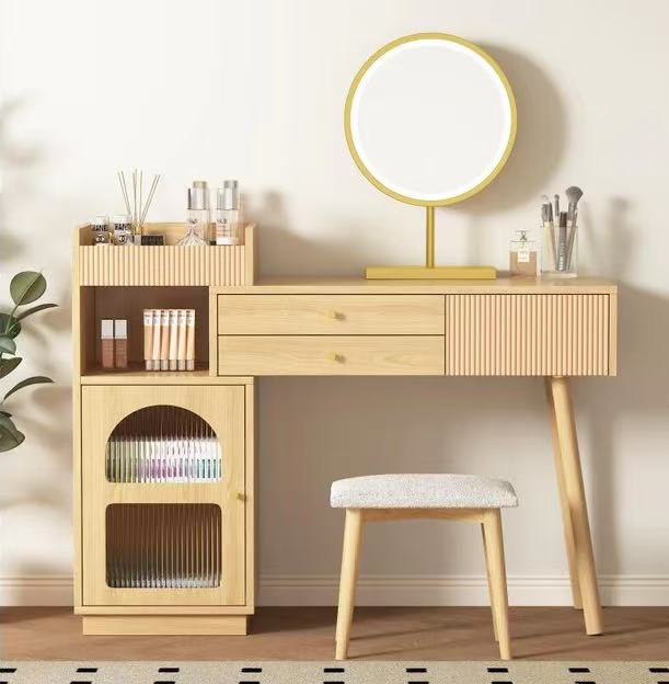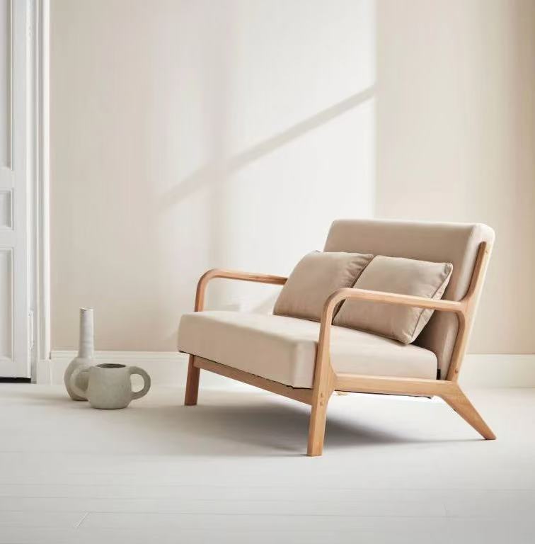 The overall design uses warm beige fabric, creating a soft, earthy atmosphere that makes the home feel more peaceful and comfortable.
